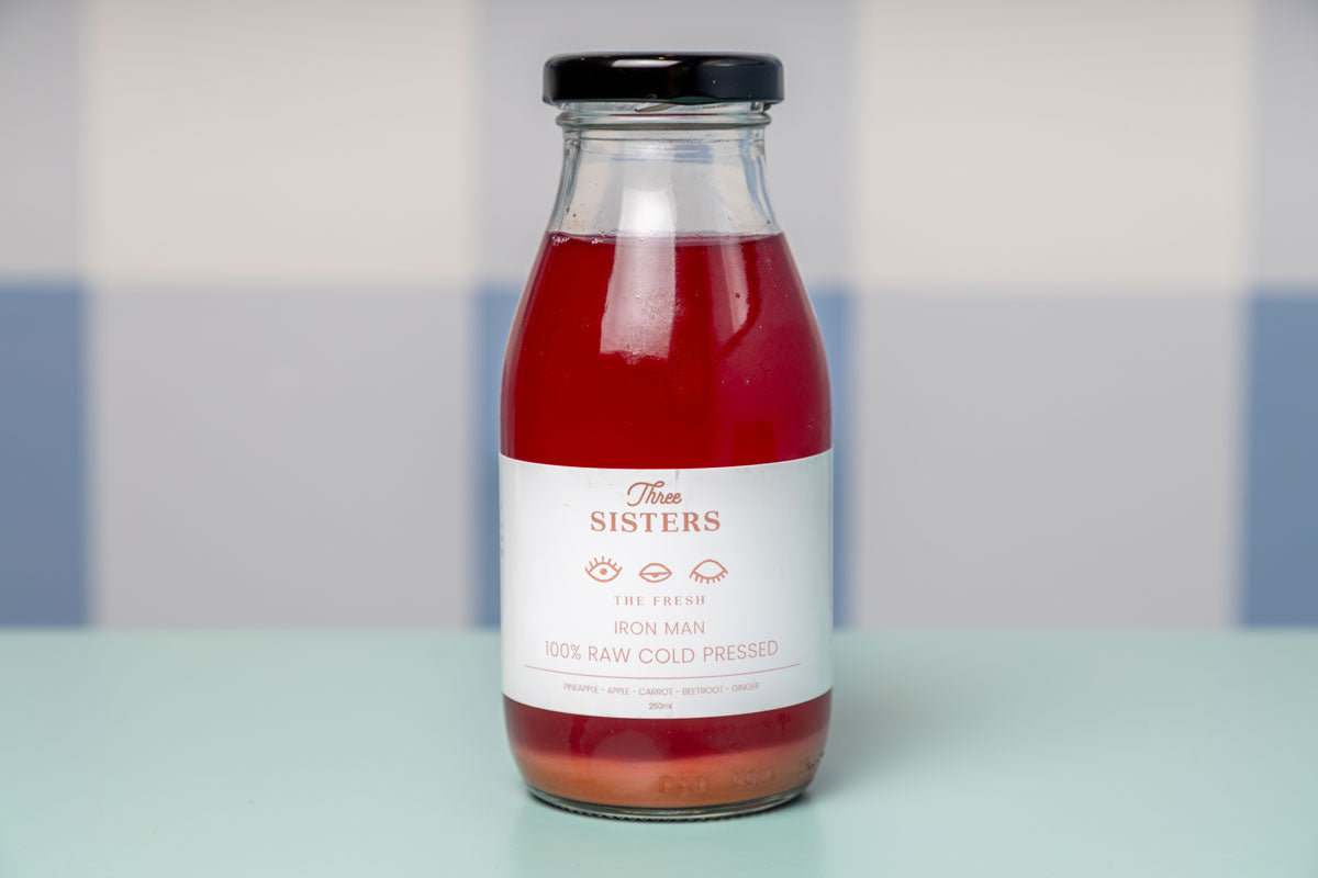 Start your day with our Iron Man juice! A powerful fusion of pineapple, apple, carrot, beetroot, and a zing of ginger, this vibrant blend delivers essential nutrients and a natural energy boost. Fuel your body right at Three Sisters.