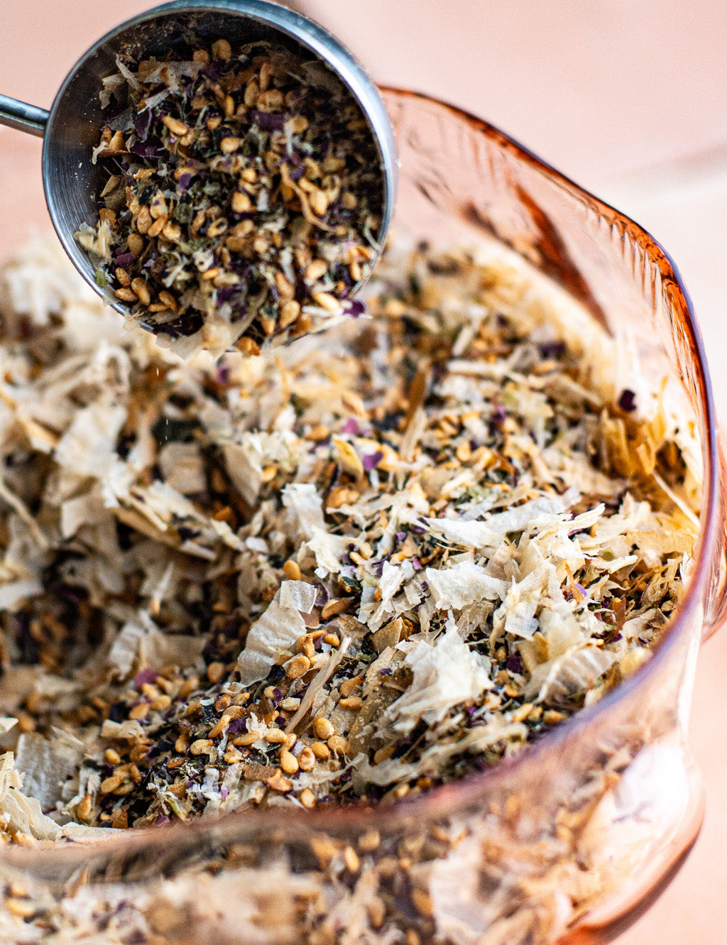 A delightful blend of dehydrated seaweed and savory dried bonito shavings harmonizes with toasted sesame seeds and crushed hazelnuts. This topping encapsulates the umami richness of the ocean, delivering a crunchy and nutrient-packed experience exclusively designed for Three Sisters Nature's Studio by Ducasse Conseil.