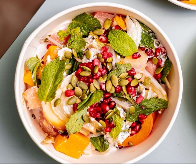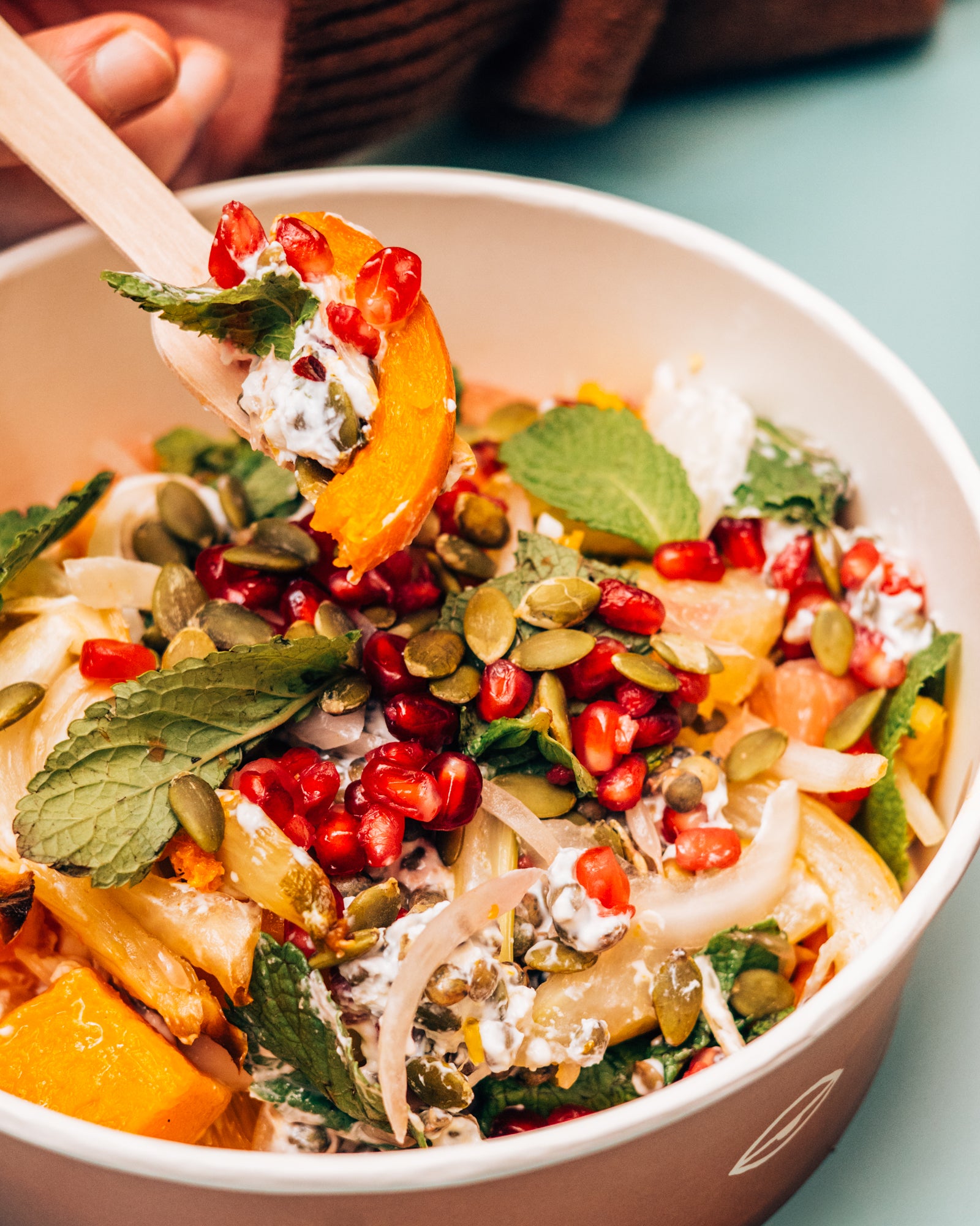 Golden roasted squash and fennel with lentils, citrus, and mint over ginger labneh, crowned with pomegranate and pumpkin seeds, dressed in citrus-turmeric-baobab essence.