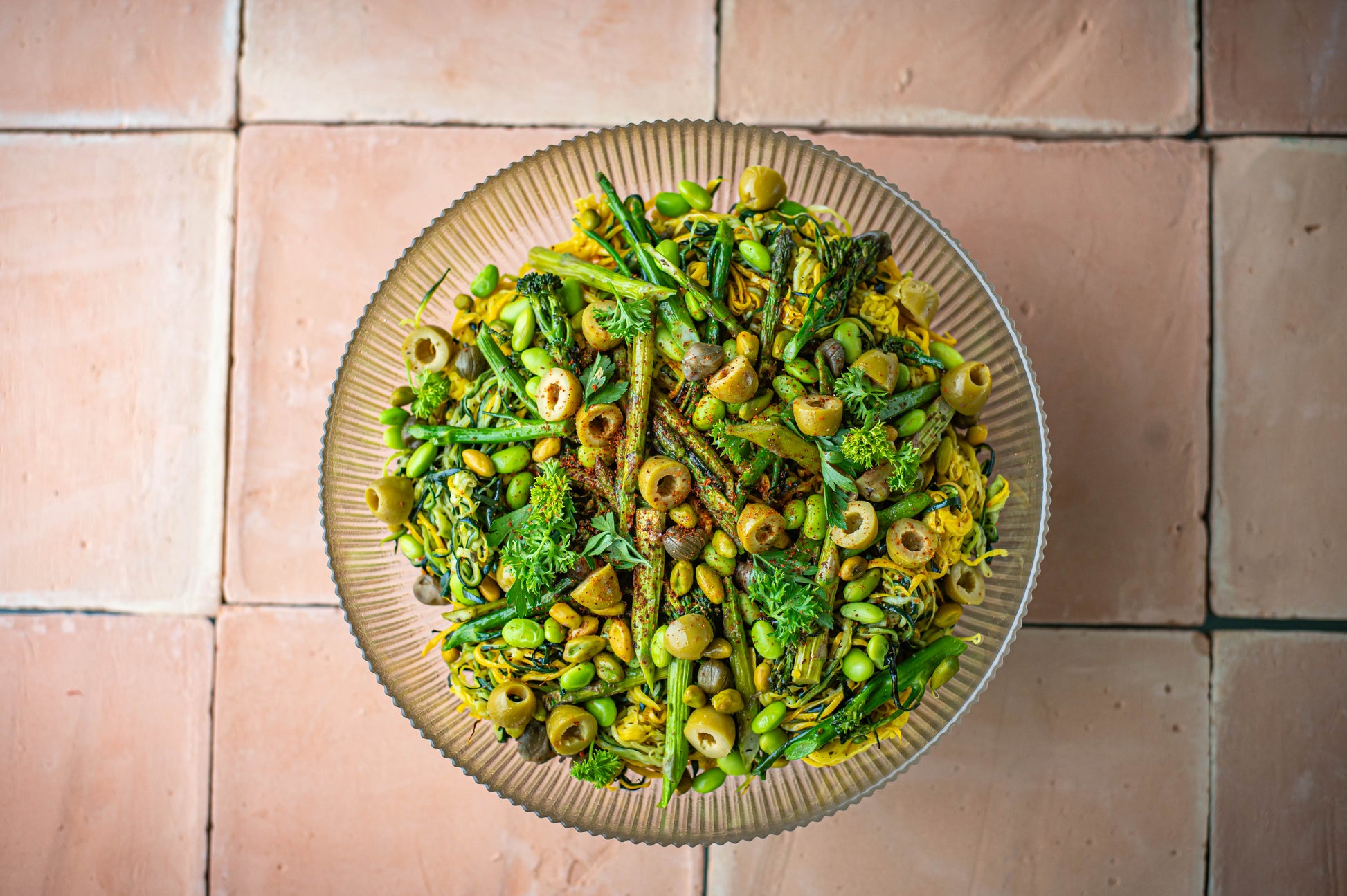 Zucchini ribbons with spring vegetables, spirulina dressing, and