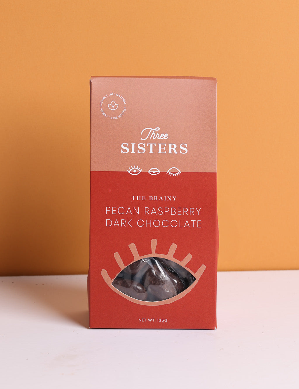 Enjoy The Smart Head – Pecan Raspberry Dark Chocolate by Three Sisters Nature’s Studio. Crunchy pecans and tangy raspberries meet smooth dark chocolate in this nutrient-rich, additive-free treat. Packed with healthy fats, vitamins, fiber, and antioxidants, it’s an ideal snack for heart health and balanced nutrition.