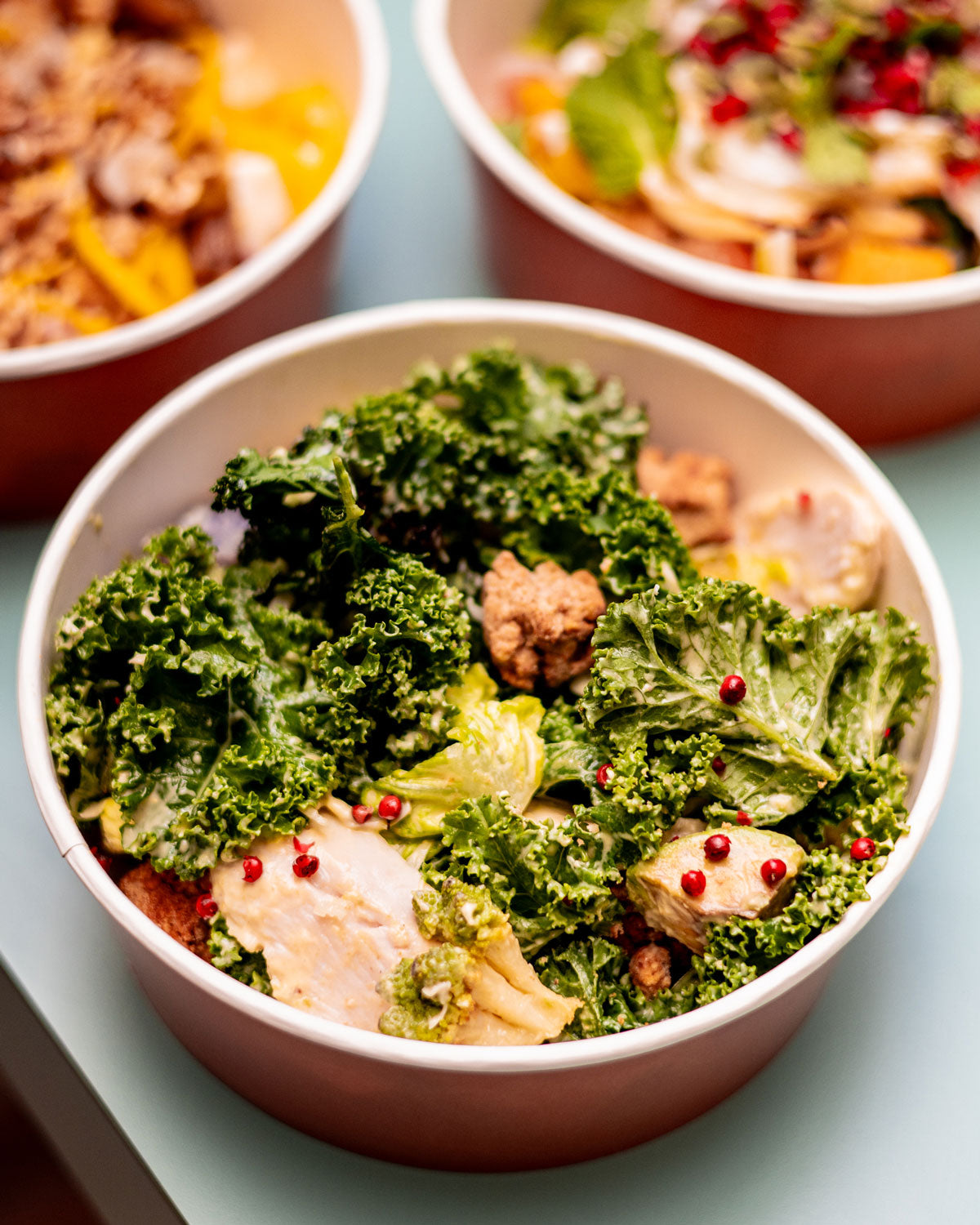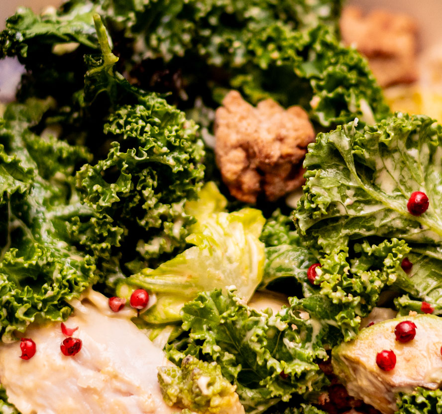 Sous-vide garlic-koji marinated chicken with caramelized Brussels sprouts, romanesco, sucrine lettuce, crispy kale, avocado, and golden croutons, tossed in a vegan Caesar dressing with espelette pepper and lime.